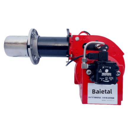 BET40型轻油燃烧器又叫做柴油燃烧器,甲醇燃烧器,轻油燃烧机,是一种流动性较好的燃油燃烧器。轻油是石油提炼后的一种油质的产物。它由不同的碳氢化合物混合组成。它的主要成分是含5到11个碳原子的链烷、环烷或芳烃。石脑油可用作提炼煤气之用。主要由油雾化器和调风器组成。轻油燃烧器在油泵在电机的带动下,将轻油(柴油)吸入后产生10-12KG工作压力的燃油送到喷油嘴进行雾化与一次空气混合后,经高压电火花点燃产生火焰.通过火焰盘(稳烟盘)的作用,与二次空气再次混合,从而形成旋转稳定的燃烧火焰.